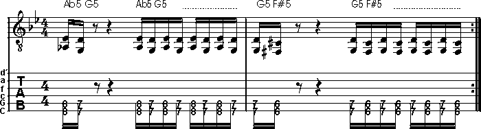 Der Part schöpft seine Energie aus der Kombination sehr präzise ausgeführter Stops (Pausen), mit turbobrachialen Powerchord-Riffs. Um eine dramatische Stille zwischen den Riffs zu gewährleisten sollte man auf jeden Fall versuchen, die Saiten zeitgleich mit der Greifhand und dem Handballen der Schlaghand abzudämpfen. Selbst im Megahigain-Betrieb erreicht man so eine optimale Wirkung der eingeschobenen Stops. Fertich! Wir hoffen es hat dir gefallen und wir konnten dir einige effektive Tipps zum Spiel des Songs mit auf den Weg geben! Keep On Rockin' Hansi Tietgen